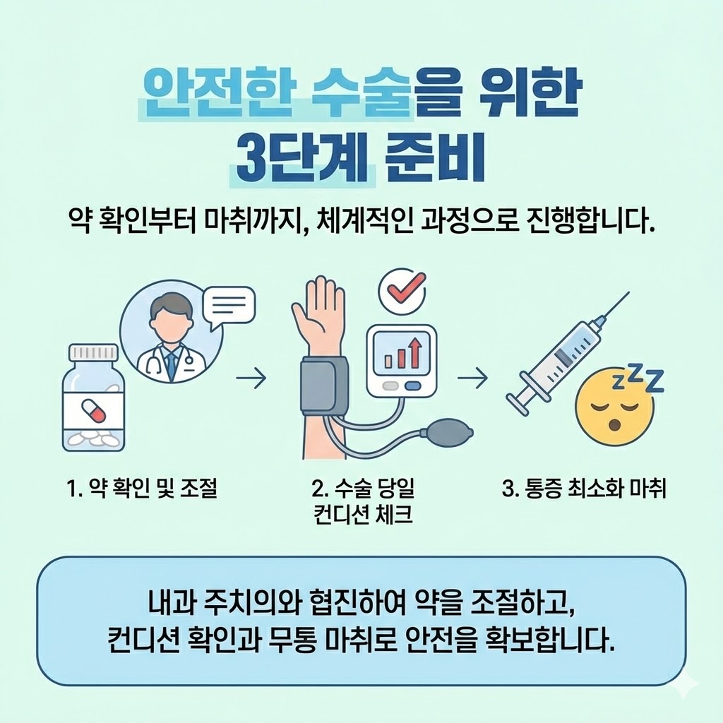 1단계는 약 확인 및 조절입니다. 수술 전에 내과 주치의와 미리 상의해서, 복용 중인 혈압약과 항응고제를 어떻게 할지 결정합니다. 혈압이 어느 정도 조절된 상태여야 시술을 진행할 수 있고, 항응고제는 전문가 판단 하에 일시적으로 조절하는 경우도 있습니다.