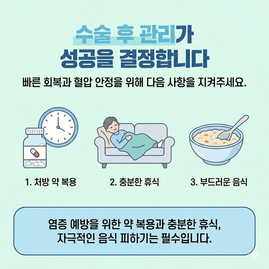 마지막으로, 수술 후 관리도 매우 중요합니다. 아무리 수술을 잘 마쳤어도 회복 과정에서 관리가 소홀하면 혈압이 올라가거나 감염이 생길 수 있습니다.