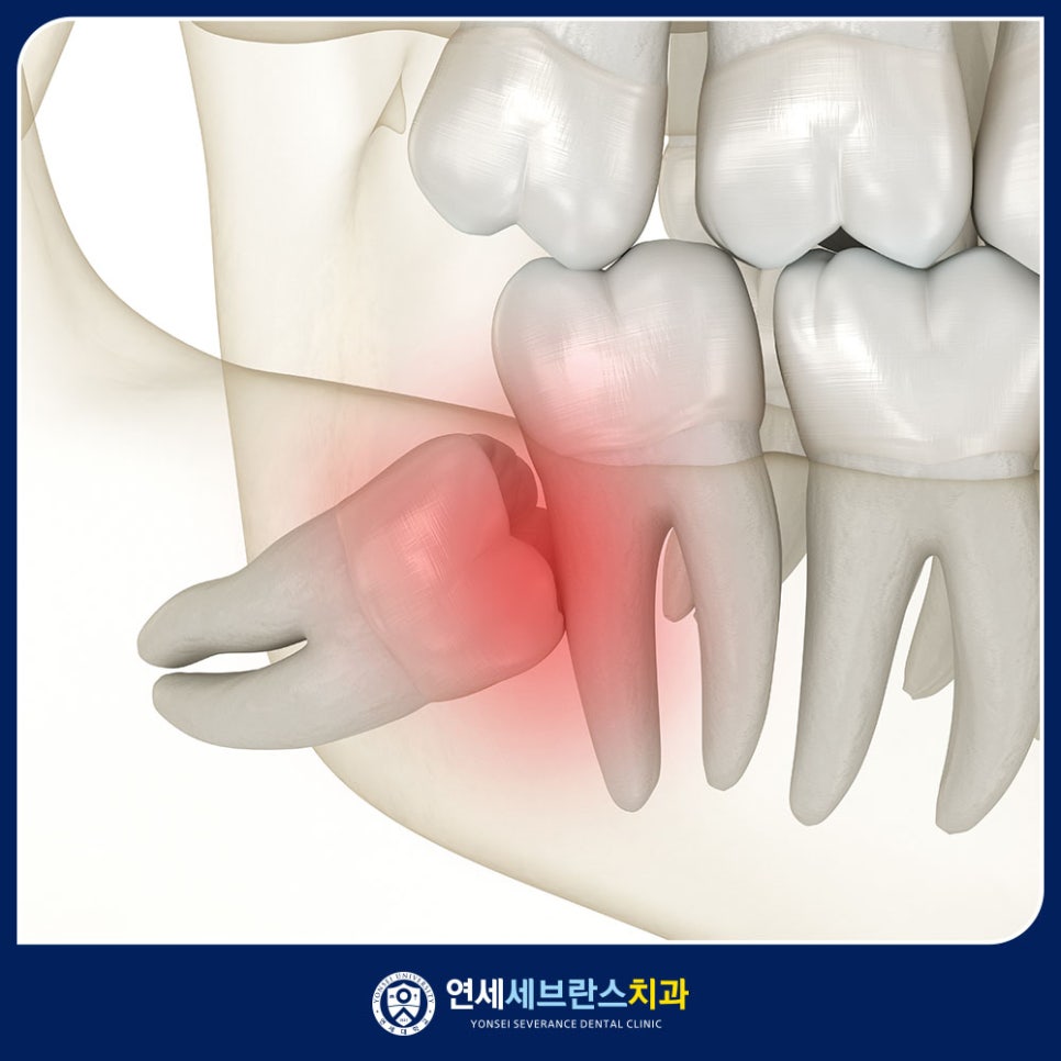 옆으로 누워 자라는 사랑니도 주의가 필요합니다. 이런 경우 앞 치아를 밀어 통증을 만들거나, 주변 치아의 배열에 영향을 줄 수 있습니다.